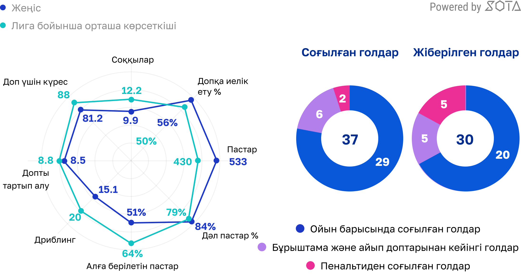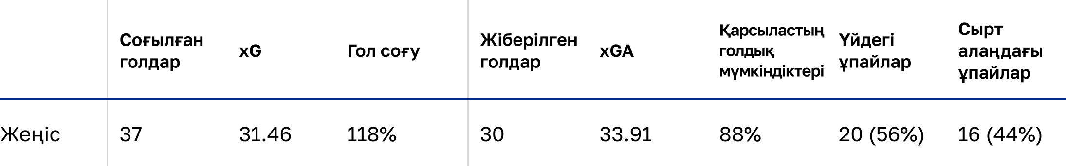 Соққылар санының шектеулі болуы тек мәселе ғана емес, «Жеңістің» ойын стратегиясының бір бөлігі ретінде де қарастырылуы мүмкін. Допты бақылау мен дәл комбинациялық ойынға сүйене отырып, команда ойыншыларын неғұрлым тиімді соққы жасау позицияларына шығаруға ұмтылды. Мұны шабуылды аяқтаудағы жоғары тиімділік айқын көрсетеді. «Жеңіс» бір матчта орта есеппен небәрі 9,9 соққы жасағанымен, оның 4,2-сі қақпаға дәл бағытталды. Соққылардың дәлдігі 42%-ды құрады, бұл — чемпионаттағы ең жоғары көрсеткіш. Сонымен қатар, соққылардың голға айналу көрсеткіші 14%-ға жетті. Бұл тұрғыда «Жеңістен» тек «Астана» ғана алда болды (16%). Мұндай профиль команда үшін соққы санын арттырудан гөрі, оның сапасына басымдық беру тән екенін көрсетеді. Соққылардың басым бөлігі қозғалыс үстінде және қарсылас қорғаушыларының айқын қарсылығынсыз орындалды. Жоғары тиімділікті соғылған голдар мен күтілетін көрсеткіштердің арақатынасы да растайды: маусым барысында «Жеңіс» жиынтық xG көрсеткіші 31,5 болғанына қарамастан, 37 гол соғып, күтілетін мәннен 18%-ға асып түсті. Жекелеген ойыншылардың көрсеткіштері де бұл үрдісті нақтылай түседі. Мысалы, Әділдің xG көрсеткіші 1,56 ғана болса да, ол 5 гол соқты. Ал Садовский күтілетін көрсеткіші шамамен 2 болғанына қарамастан, 4 голмен көзге түсті.
