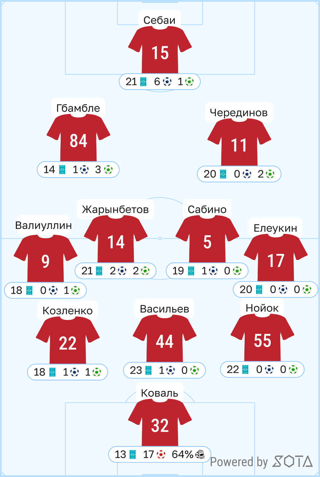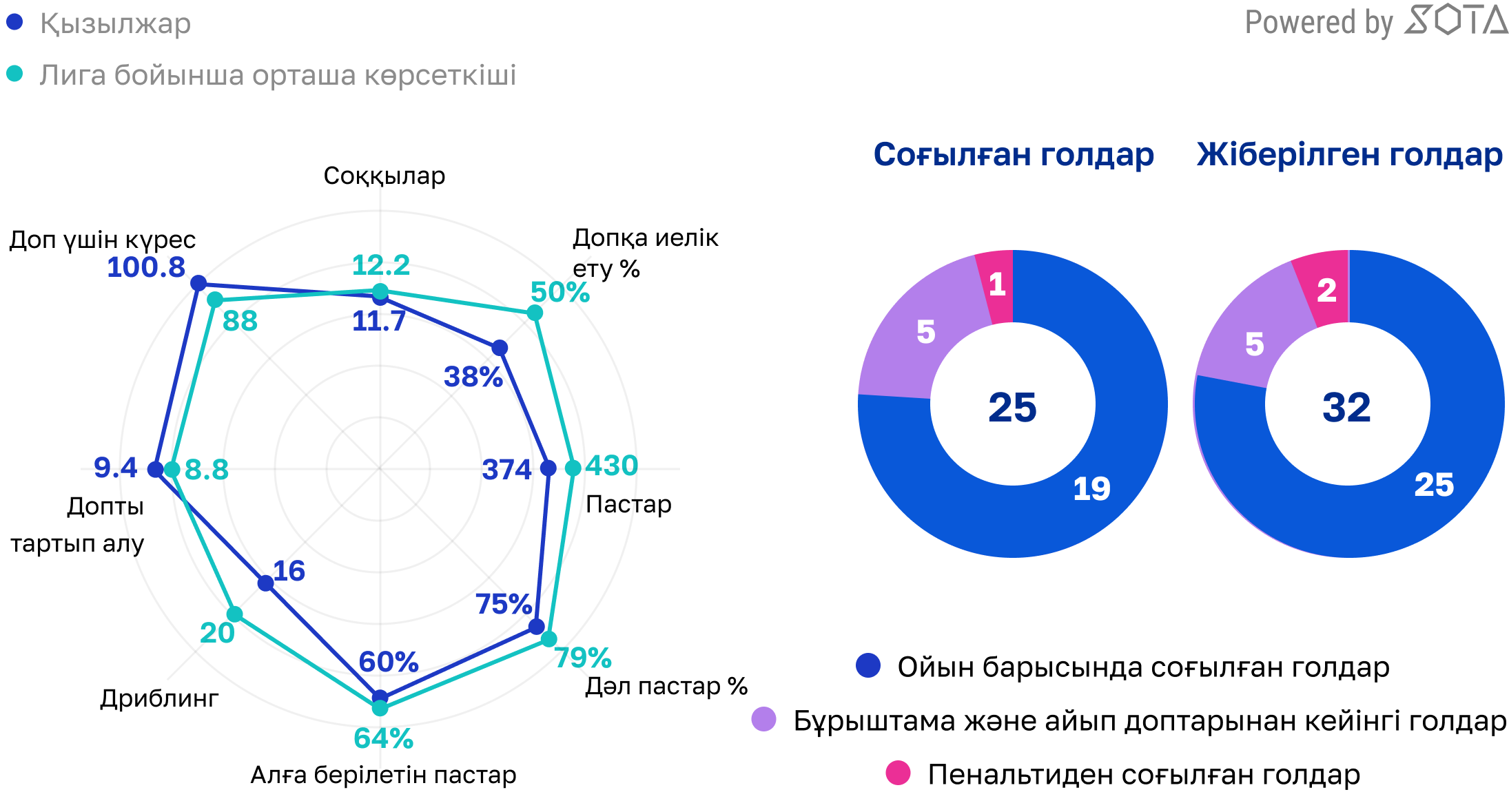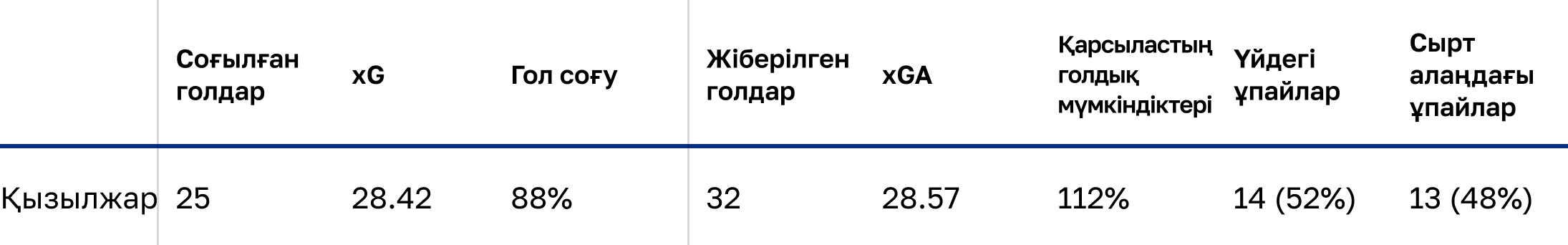 - «Қызылжардың» соққы дәлдігі 28,2%-ды құрады, бұл чемпионаттағы 13-ші көрсеткіш. Ал пастар дәлдігі 76%-ды құрады, бұл да 13-ші көрсеткіш, бұдан төмен нәтиже тек «Қайсарда» (73%) ғана тіркелді.
